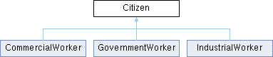 The Citizen class serves as a base class for various types of citizens, encapsulating common properties such as residence, workplace, and satisfaction levels. This class defines the interface for all citizen types.