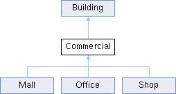 The Commercial class is derived from the Building class and serves as a base class for various types of commercial buildings. It includes attributes specific to commercial buildings, such as capacity and the number of floors.