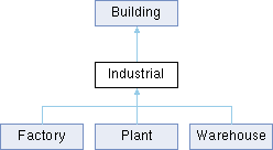 The Industrial class is derived from the Building class and serves as a base class for various types of industrial buildings. It includes attributes specific to industrial buildings, such as carbon footprint and capacity.