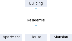 The Residential class is derived from the Building class and serves as a base class for different types of residential buildings. It includes attributes specific to residential buildings, such as bedrooms, bathrooms, and capacity.